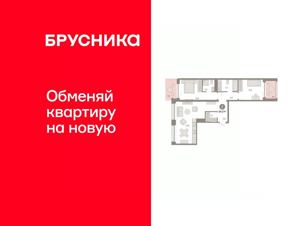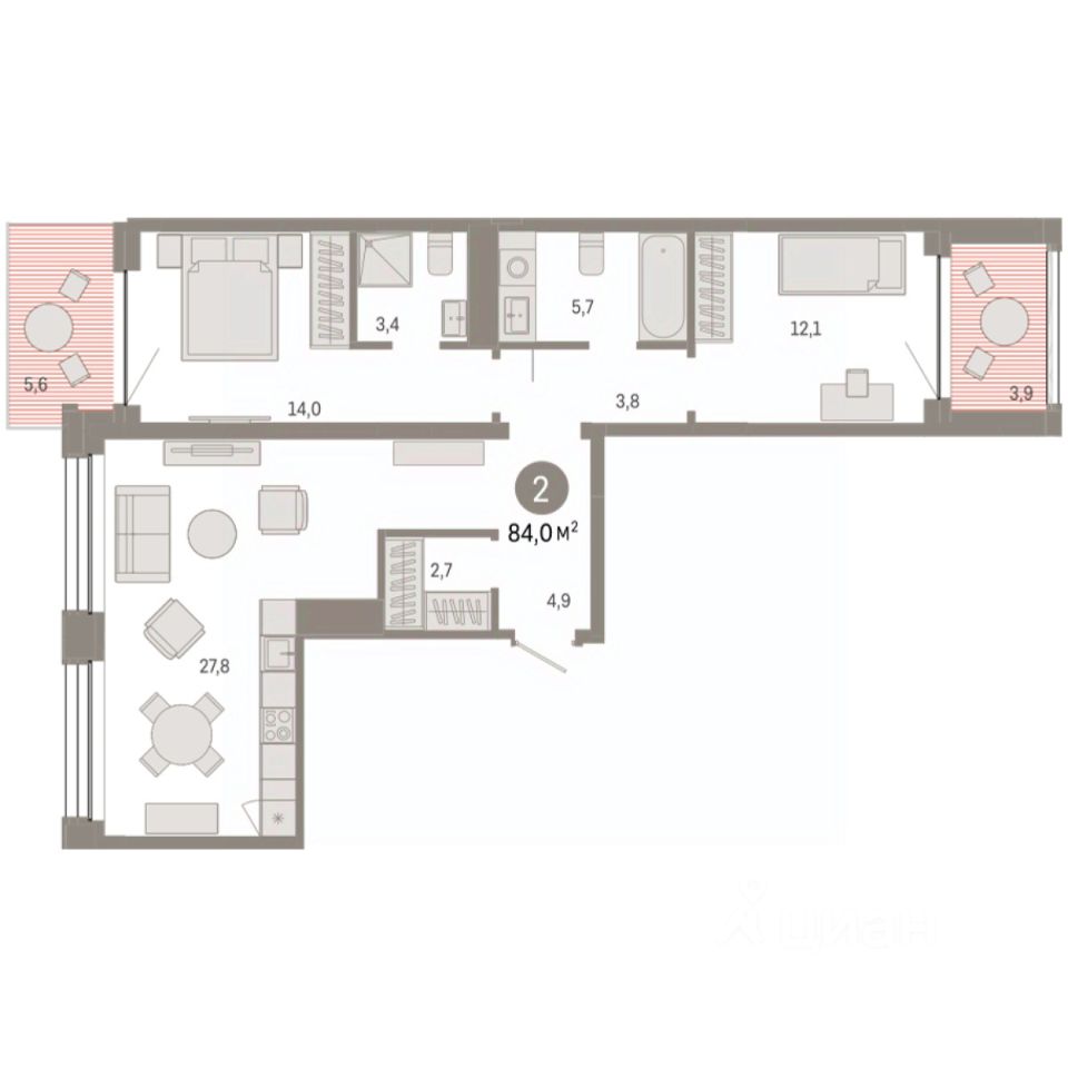 Квартира с кухней-гостиной и двумя спальнями в Доме у озера. Особенности планировки: балкон, предчистовая отделка, разнесённые спальни. квартиры в нашей базе: ДМУ-02-5-5.2.1.