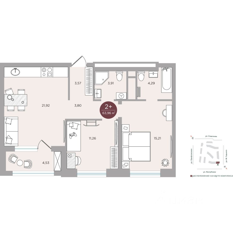 Территория квартала - это квадрат улиц Профсоюзная-Республики-Советская-М.Горького. Застройщиком спроектированы квартиры от студий до четырехкомнатных, общей площадью от 29.6 до 146.3 кв. м. Дома сдаются в предчистовой отделке.