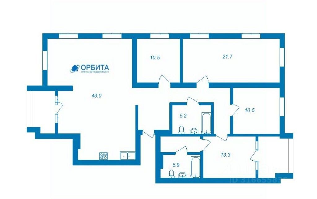 Квартира расположена на третьем этаже 5-ти этажного дома, состоит из трех спальных комнат, кабинета, просторной кухни-гостиной площадью 48 кв.м, прихожей, двух сан узлов, балкона и лоджии.