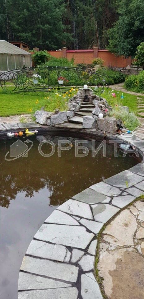 Искусственный пруд с горкой - фонтаном и мостиком. Отдельно на участке располагаются, крытая площадка(навес 15х5), теплица, овощехранилище, летний домик с печкой-камином (мангал), вольер и строение под гостевой дом - баню.