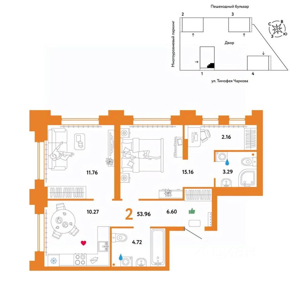 Продается 2комнатная квартира от застройщика ''Страна Девелопмент''. Стоимость указана без учета акций. Квартира на 18 этаже, площадь квартиры 53,96 кв. м. Сдача — в 3 квартале 2025 года.