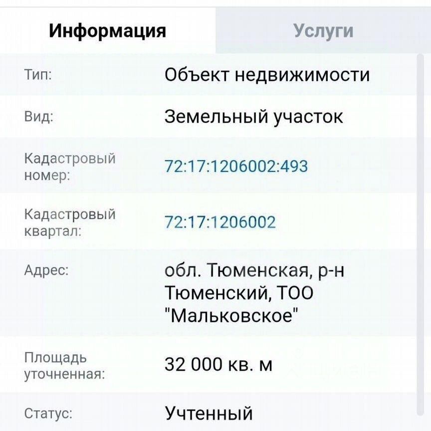 Продается земельный участок по Старо-Тобольскому тракту в село Мальково. Категория земли - сельскохозяйственного назначения. Земельный участок 3,2 гектара. Кадастровый номер: 72:17:1206002:493.
