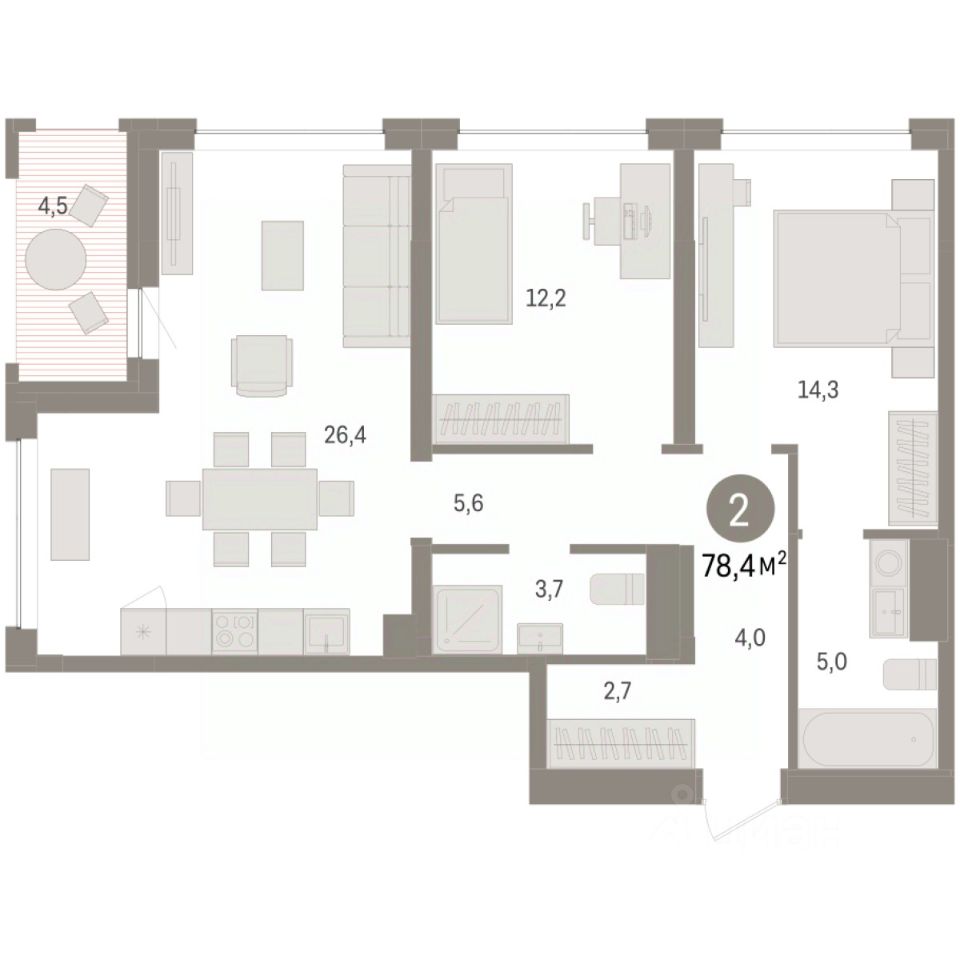Квартира с кухней-гостиной и двумя спальнями в Доме у озера. Особенности планировки: предчистовая отделка, разнесённые спальни. квартиры в нашей базе: ДМУ03-Ж4.2.5.
