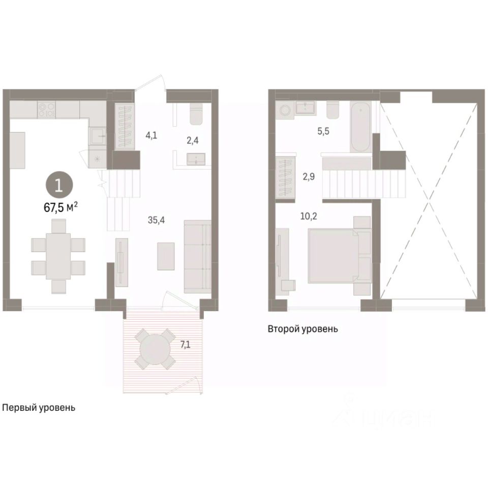 Продается однокомнатная квартира с предчистовой отделкой в ЖК ''Дом у озера'' на 1 этаже. 2-уровневая квартира, на каждом этаже вы можете выделить различные функциональные зоны. Общая площадь: 67.53 кв.м., жилая: 10.2 кв.м., площадь просторной кухни-гостиной: 35.8 кв.м. Все окна выходят на одну сторону. В квартире один балкон, один совмещенный и один раздельный санузел. Высота потолков 2.7 м.