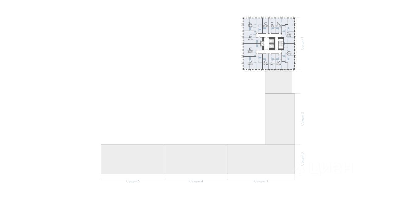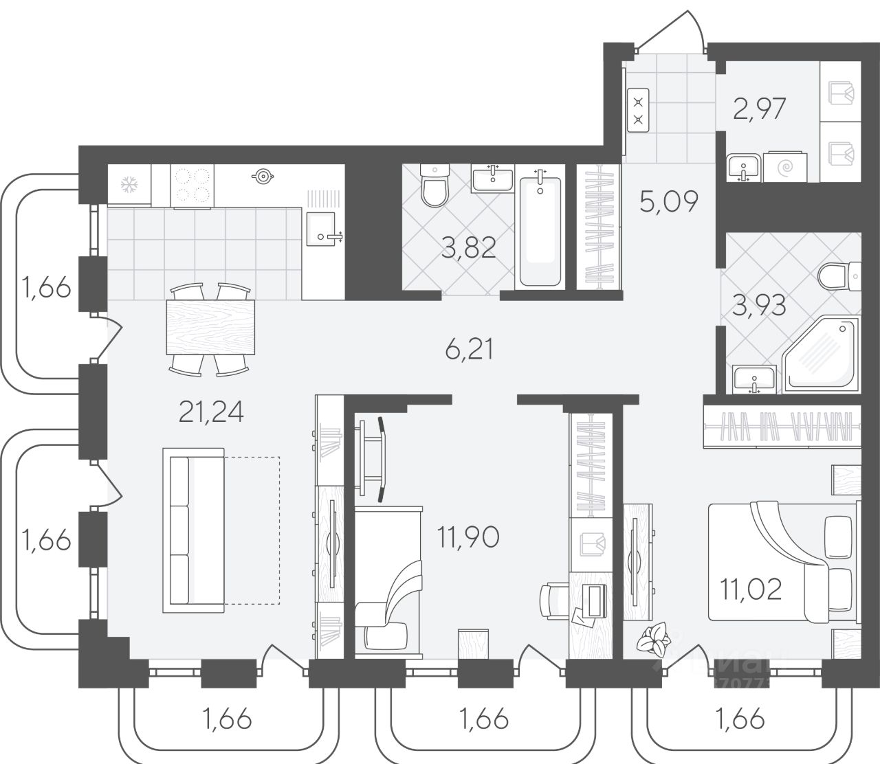 Квартира с 2 спальнями площадью 74,48 кв.м