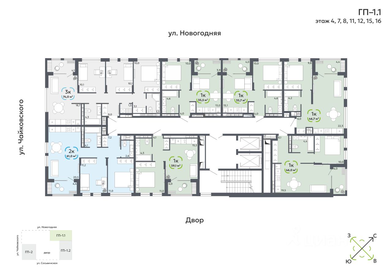 ЖК ''Свой'' — жилой комплекс для людей, которым важно чувство родного места и домашней атмосферы. Проект включает в себя 2 дома высотой 16 этажей. Здесь 360 квартир площадью от 34 до 74 м2. Срок сдачи 1 квартал 2028 год. ЖК расположен на пересечении улиц Ватутина, Щербакова и Чайковского — это тихий, спокойный район в Центральном округе Тюмени. Здесь развитая инфраструктура: поблизости несколько детских садов и школ, медицинские учреждения, крупные торговые центры, фитнес-клубы и парки для отдыха. В закрытых дворах: зоны для тихого отдыха, площадка для детей с лабиринтом, всесезонные деревья и кустарники. Шумные зоны вынесены за пределы двора. Здесь находится зона для воркаута и баскетбольная площадка, коворкинг-зоны, а также экран для просмотра фильмов. Для парковки автомобилей обустроено 323 машиноместа. В каждой парадной есть теплый тамбур и домофон с Face ID. В колясочных установлен пост для подкачки колёс и лапомойка для домашних питомцев. В проекте широкий выбор квартир: площадью от 34 до 74 м2, с мастер-спальнями, постирочными, просторными кухнями-гостиными, двумя санузлами, с окнами в ванной.