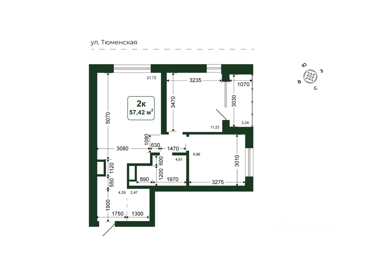 Общая площадь57,42 м2