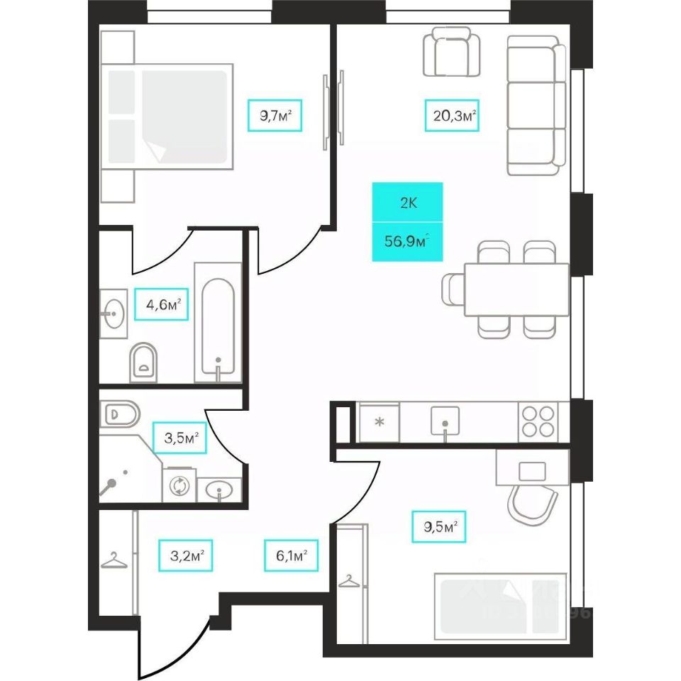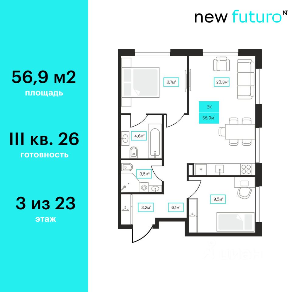 Продаётся 2-комнатная квартира в строящемся доме (Дом 6к1), срок сдачи: III-кв. 2026, общей площадью 56.9 кв.м., на 3 этаже. Новый жилой комплекс ''Futuro'' от застройщика ''newton'' расположен в г. Тюмень на Ставропольской улице.