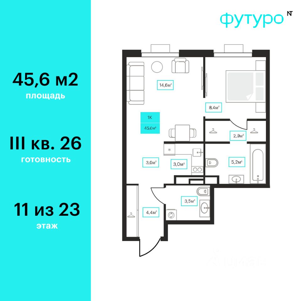 Продаётся 1-комнатная квартира в строящемся доме (Дом 6к1), срок сдачи: III-кв. 2026, общей площадью 45.6 кв.м., на 11 этаже. Новый жилой комплекс ''Futuro'' от застройщика ''newton'' расположен в г. Тюмень на Ставропольской улице.