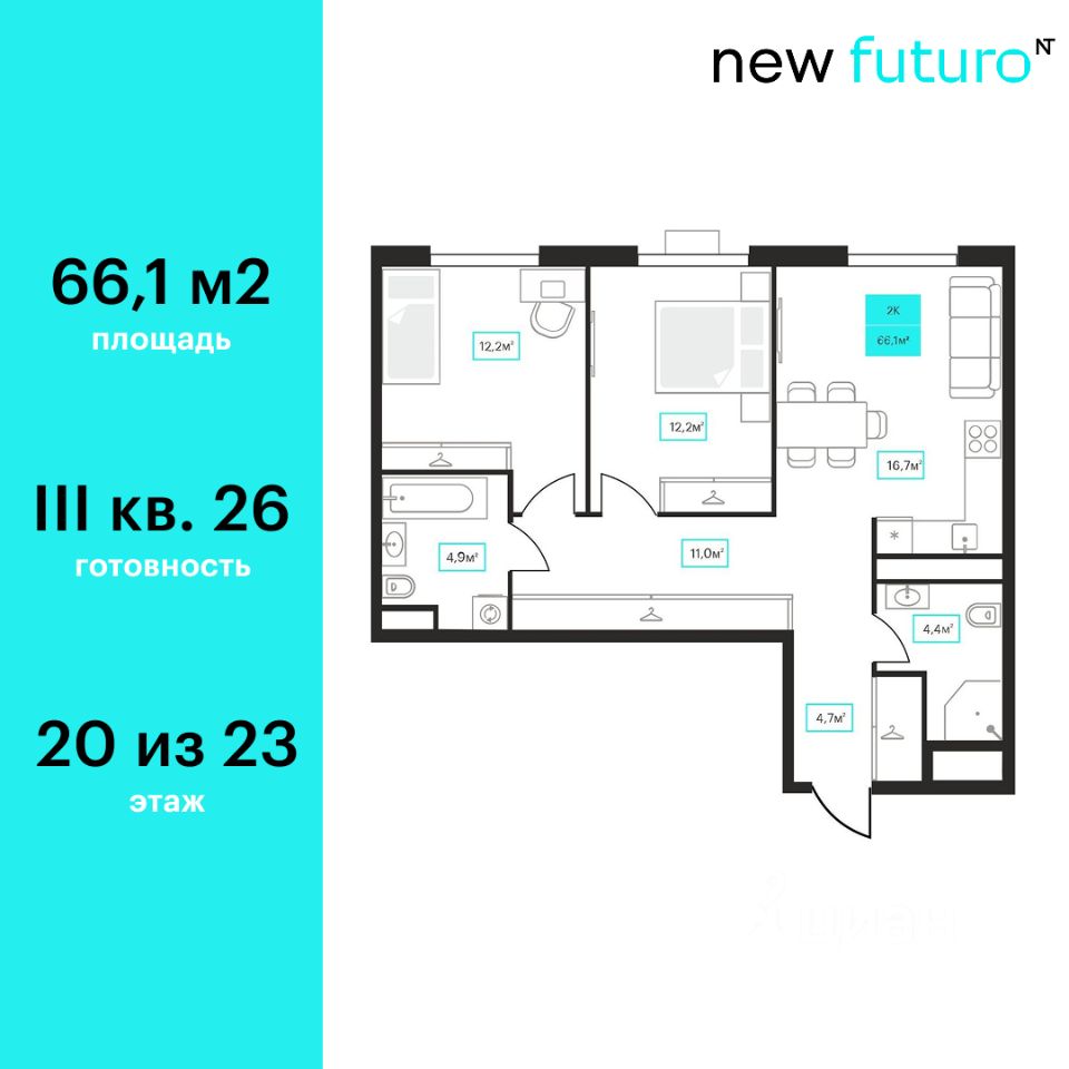 Продаётся 2-комнатная квартира в строящемся доме (Дом 6к1), срок сдачи: III-кв. 2026, общей площадью 66.1 кв.м., на 20 этаже. Новый жилой комплекс ''Futuro'' от застройщика ''newton'' расположен в г. Тюмень на Ставропольской улице.