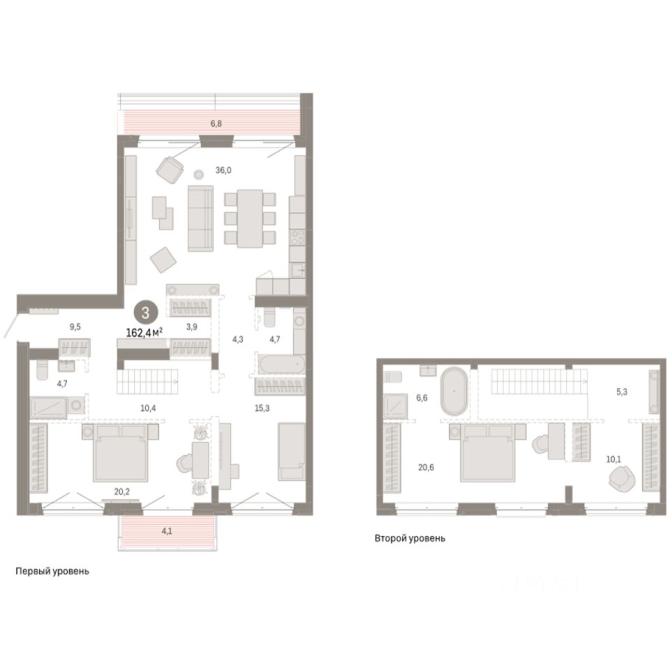Двухуровневая квартира с кухней-гостиной и тремя спальнями в кварталах ''На Минской''. Особенности планировки: балкон, вид во двор, второй санузел, гардеробная, двухуровневая, мастер-спальня, окна в пол, потолки 3 м и выше, предчистовая отделка, разнесённые спальни, терраса на крыше. квартиры в нашей базе: МНС02-Ж9.7.3.