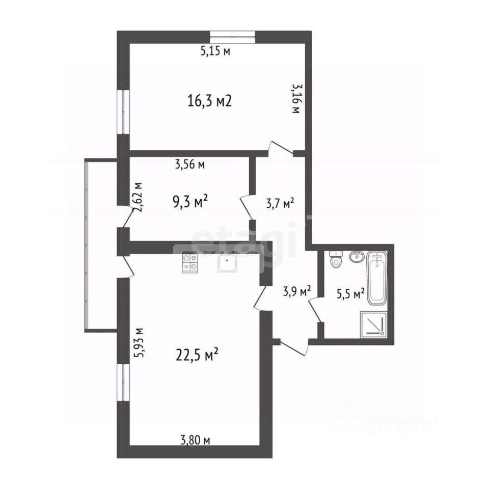Основные характеристики: - Общая площадь: 61,2 м² - Этаж: 6-й этаж кирпичного дома - Количество комнат: 2 изолированных спальни + просторная кухня-гостиная - Санузел: совмещённый, оборудован всей необходимой сантехникой - Дополнительные помещения: остеклённая лоджия, выходящая в обе комнаты - Полезные площади: - Кухня-гостиная: 22,5 м² - Спальни: 16,3 м² и 9,3 м² - Санузел: 5,5 м²