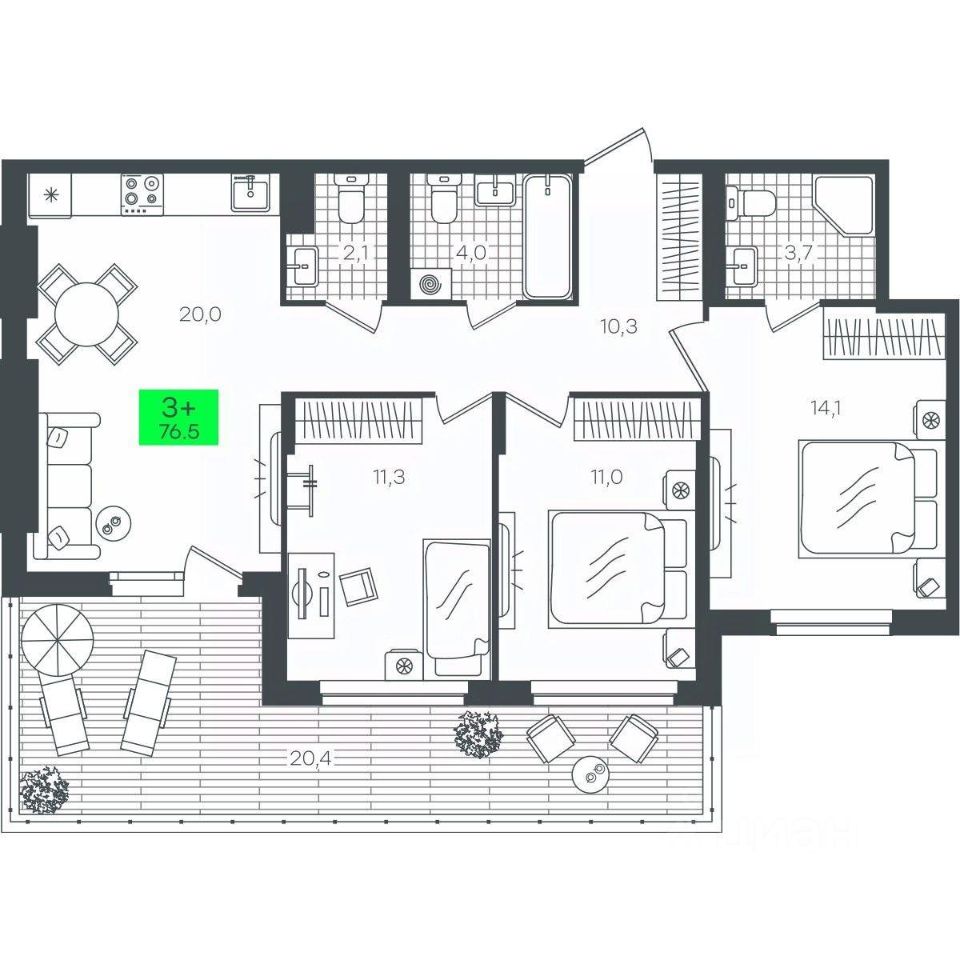Квартира 3+ с террасой на первом этаже. Кухня-гостиная выходит на большую террасу, которую можно использовать, как место для игр детей, вечерних чаепитий или для занятий спортом на свежем воздухе. В одной спален спроектирована отдельная ванная комната. Для удобства семьи в квартире предусмотрено 2 санузла. Кухня-гостиная удобно зонируется на 2 пространства: столовую и гостевую зону. ЖК Андерсен Парк, Д6.4, 1, 2, квартира 277