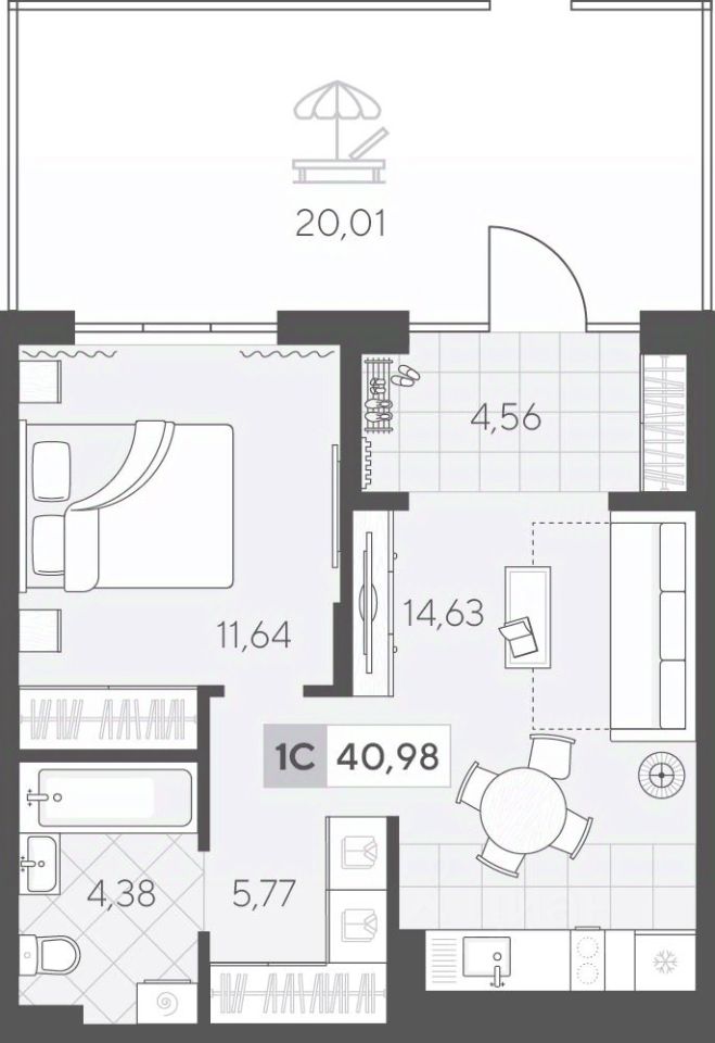 Уютная однокомнатная квартира 40.98 кв.м на 1 этаже. Функциональная планировка позволяет удобно организовать быт, а кухня-гостиная подойдёт для отдыха и общения.