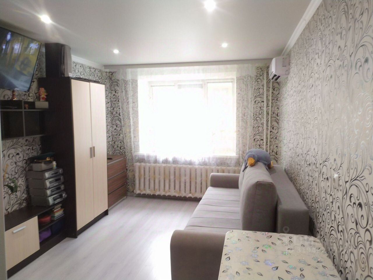 Пластиковое окно ,на полу ламинат, натяжные потолки, кондиционер, водонагреватель.В сан.узле плитка.Проведена новая электропроводка, заменены трубы ГВ и ХВ водоснабжения