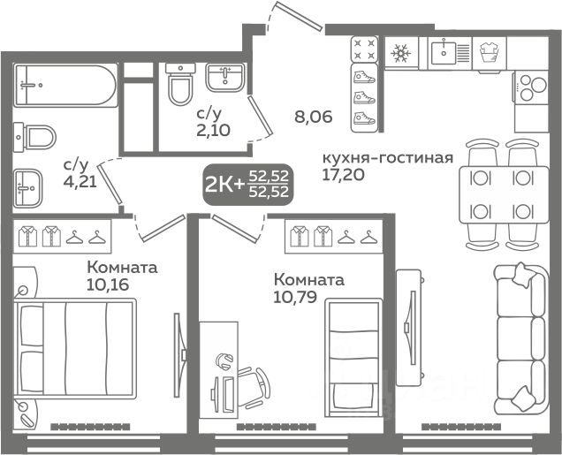 Прямая продажа от застройщика! Продается двухкомнатная квартира в строящемся ЖК ''Меридиан Слобода'', срок сдачи: I-кв. 2027, общей площадью 52.52 м², на 8 этаже из 21. Площадь кухни — 17.2 м².