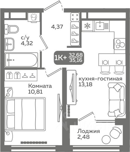 Прямая продажа от застройщика! Продается однокомнатная квартира в строящемся ЖК ''Меридиан Слобода'', срок сдачи: I-кв. 2027, общей площадью 35.16 м², на 16 этаже из 21. Площадь кухни — 13.18 м².