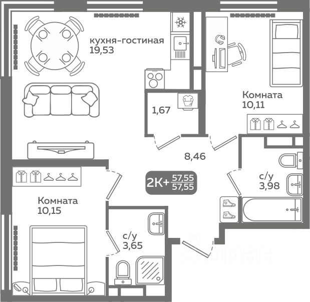 Прямая продажа от застройщика! Продается двухкомнатная квартира в строящемся ЖК ''Меридиан Слобода'', срок сдачи: I-кв. 2027, общей площадью 57.55 м², на 9 этаже из 21. Площадь кухни — 19.53 м².