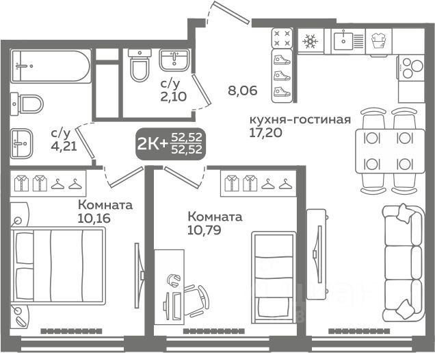 Прямая продажа от застройщика! Продается двухкомнатная квартира в строящемся ЖК ''Меридиан Слобода'', срок сдачи: I-кв. 2027, общей площадью 52.52 м², на 10 этаже из 21. Площадь кухни — 17.2 м².