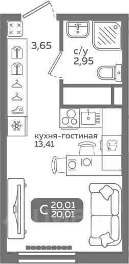 Прямая продажа от застройщика! Продается студия в строящемся ЖК ''Меридиан Слобода'', срок сдачи: I-кв. 2027, общей площадью 20.01 м², на 10 этаже из 21. Площадь кухни — 13.41 м².