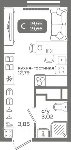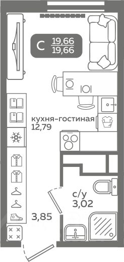 Прямая продажа от застройщика! Продается студия в строящемся ЖК ''Меридиан Слобода'', срок сдачи: I-кв. 2027, общей площадью 19.66 м², на 12 этаже из 21. Площадь кухни — 12.79 м².
