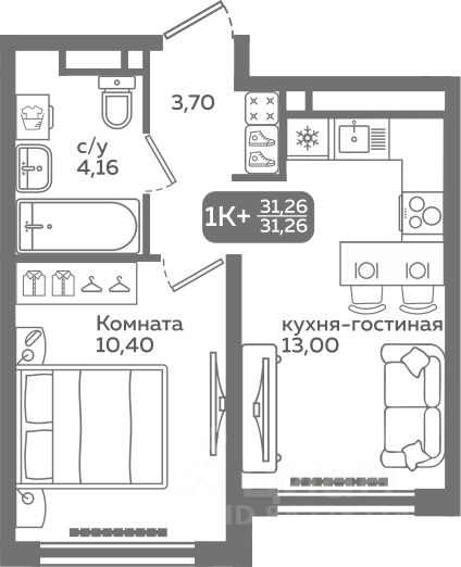 Прямая продажа от застройщика! Продается однокомнатная квартира в строящемся ЖК ''Меридиан Слобода'', срок сдачи: I-кв. 2027, общей площадью 31.26 м², на 15 этаже из 21. Площадь кухни — 13 м².