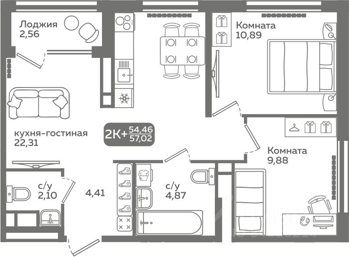 Прямая продажа от застройщика! Продается двухкомнатная квартира в строящемся ЖК ''Меридиан Слобода'', срок сдачи: I-кв. 2027, общей площадью 57.02 м², на 18 этаже из 21. Площадь кухни — 22.31 м².