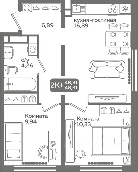 Прямая продажа от застройщика! Продается двухкомнатная квартира в строящемся ЖК ''Меридиан Слобода'', срок сдачи: I-кв. 2027, общей площадью 48.31 м², на 18 этаже из 21. Площадь кухни — 16.89 м².