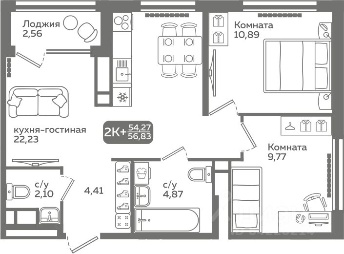 Прямая продажа от застройщика! Продается двухкомнатная квартира в строящемся ЖК ''Меридиан Слобода'', срок сдачи: I-кв. 2027, общей площадью 56.83 м², на 19 этаже из 21. Площадь кухни — 22.23 м².