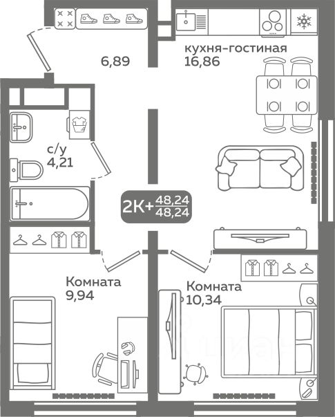 Прямая продажа от застройщика! Продается двухкомнатная квартира в строящемся ЖК ''Меридиан Слобода'', срок сдачи: I-кв. 2027, общей площадью 48.24 м², на 21 этаже из 21. Площадь кухни — 16.86 м².