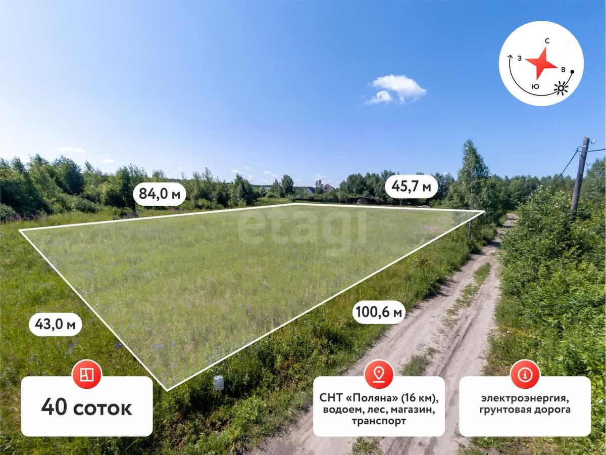 Участок площадью 40 соток расположен в СНТ ''Поляна'' в 16 км от Тюмени по Салаирскому тракту.