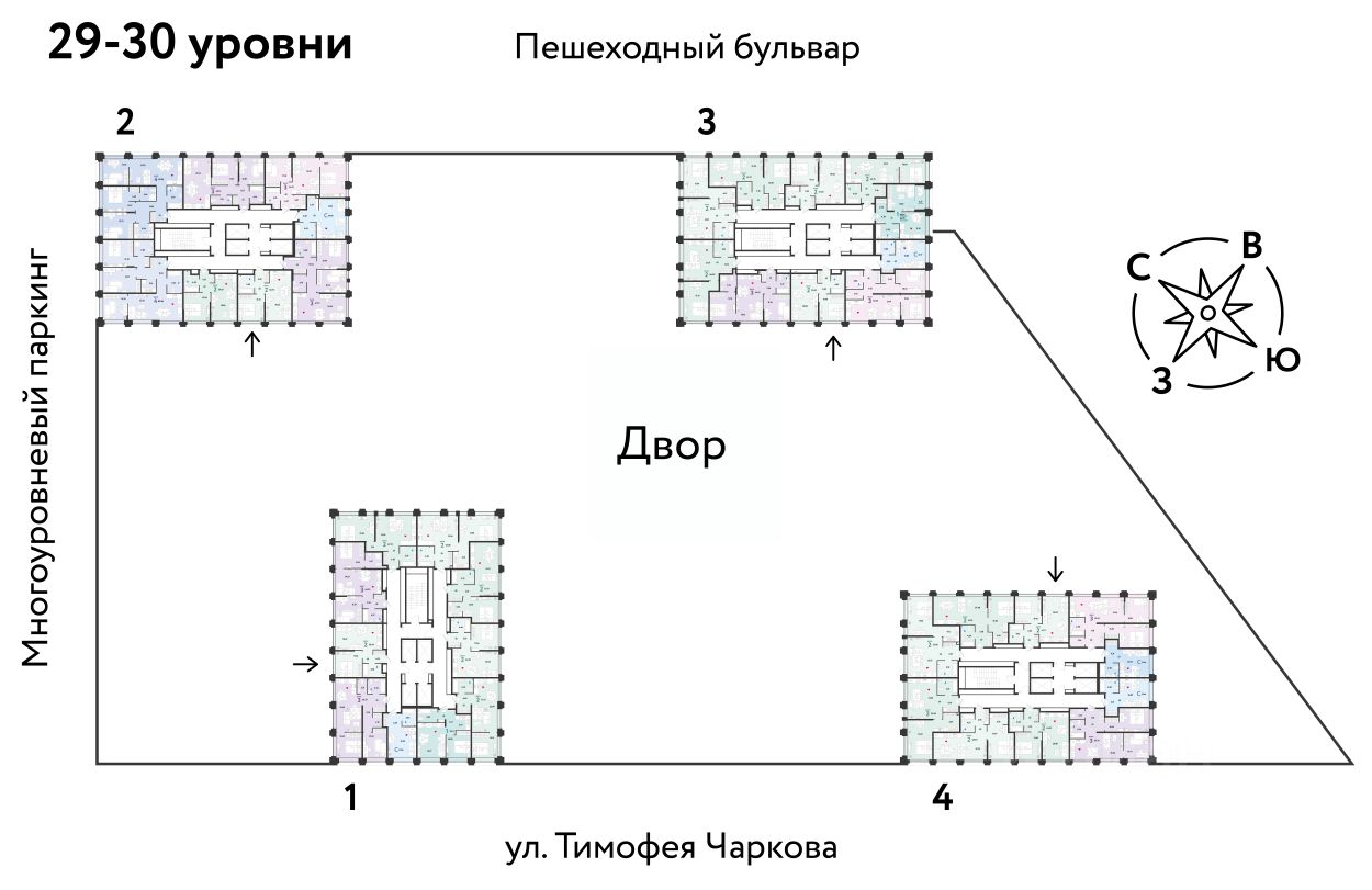 Четыре 32-этажные башни со смещенными осями, объединенные общим стилобатом. На крыше дома появятся детские и спортивные площадки, зоны для релакса и отдыха. А в самом стилобате — торговая галерея и паркинг.