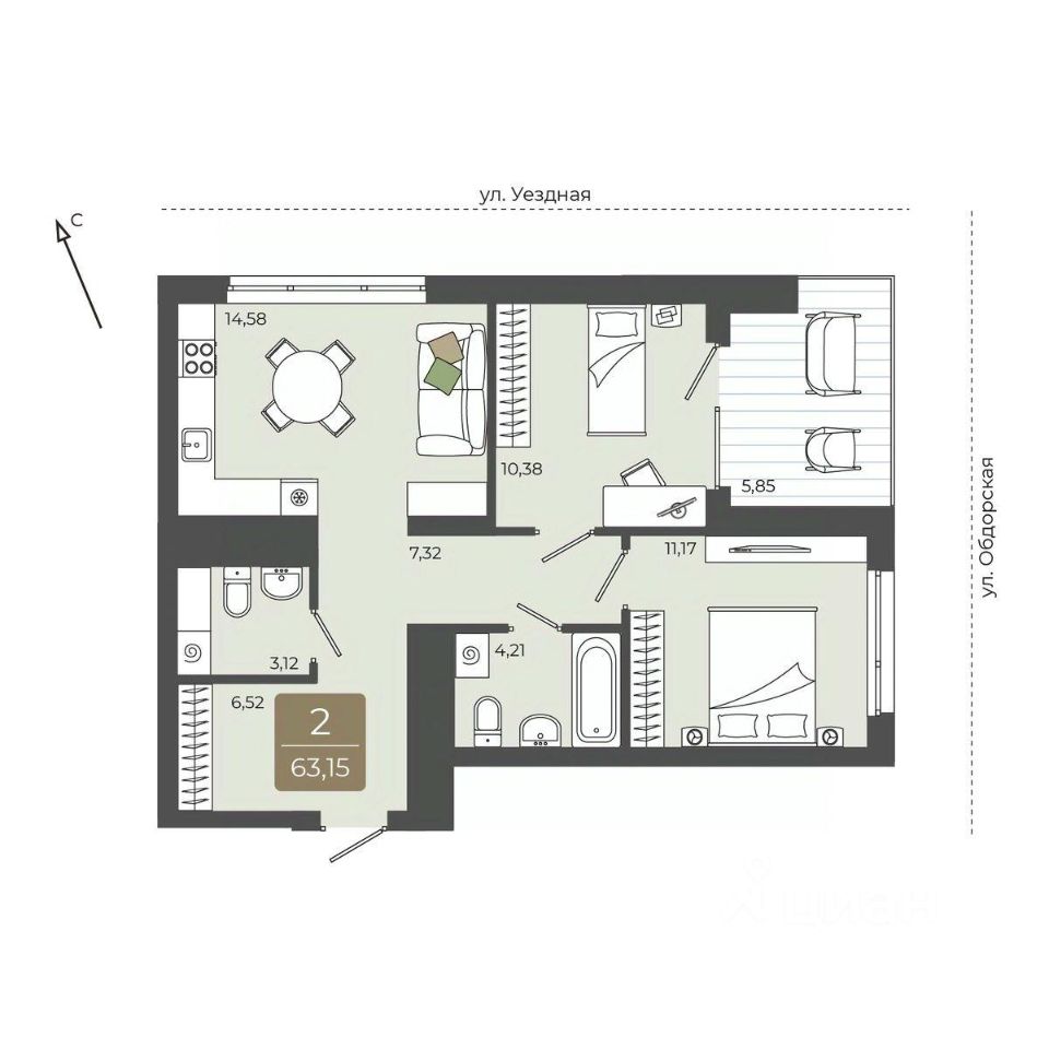 продам 2-к, Василия Подшибякина, 57 130 000 ₽