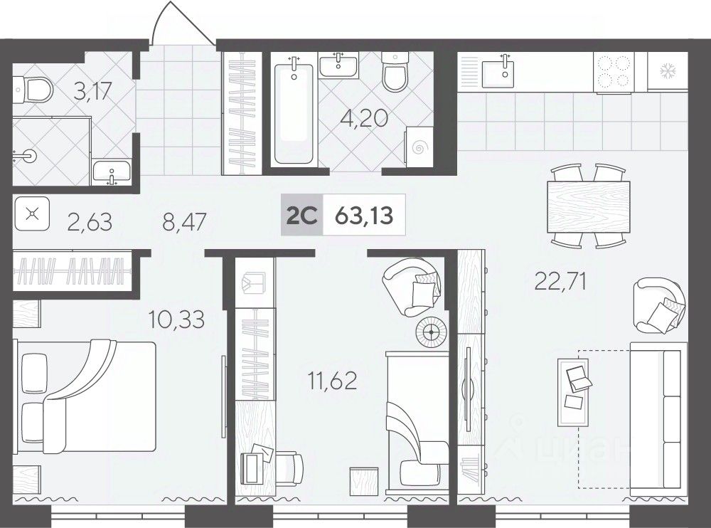 Двухкомнатная квартира 63.13 кв.м на 2 этаже — идеальный вариант для молодой семьи или пары. Просторная кухня-гостиная станет местом семейных встреч, а две спальни обеспечат удобство и приватность для каждого.