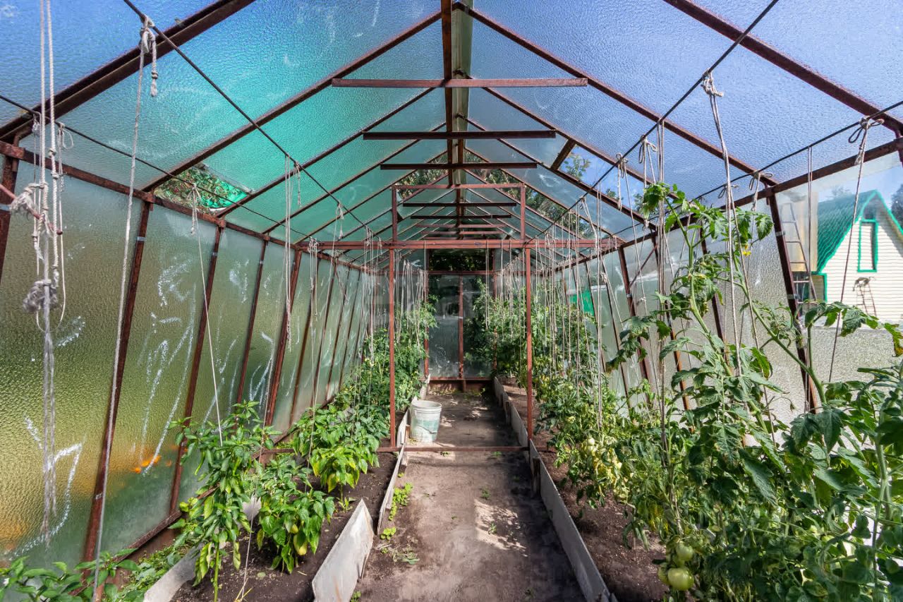 Гараж-сарай из кирпича — 18 м². Теплицы стеклянные 3х6 — высажена рассада, участок вскопан, обработан. Водоснабжение: колодец и скважина, есть питьевая вода и полив — насосы, шланги, всё на месте.