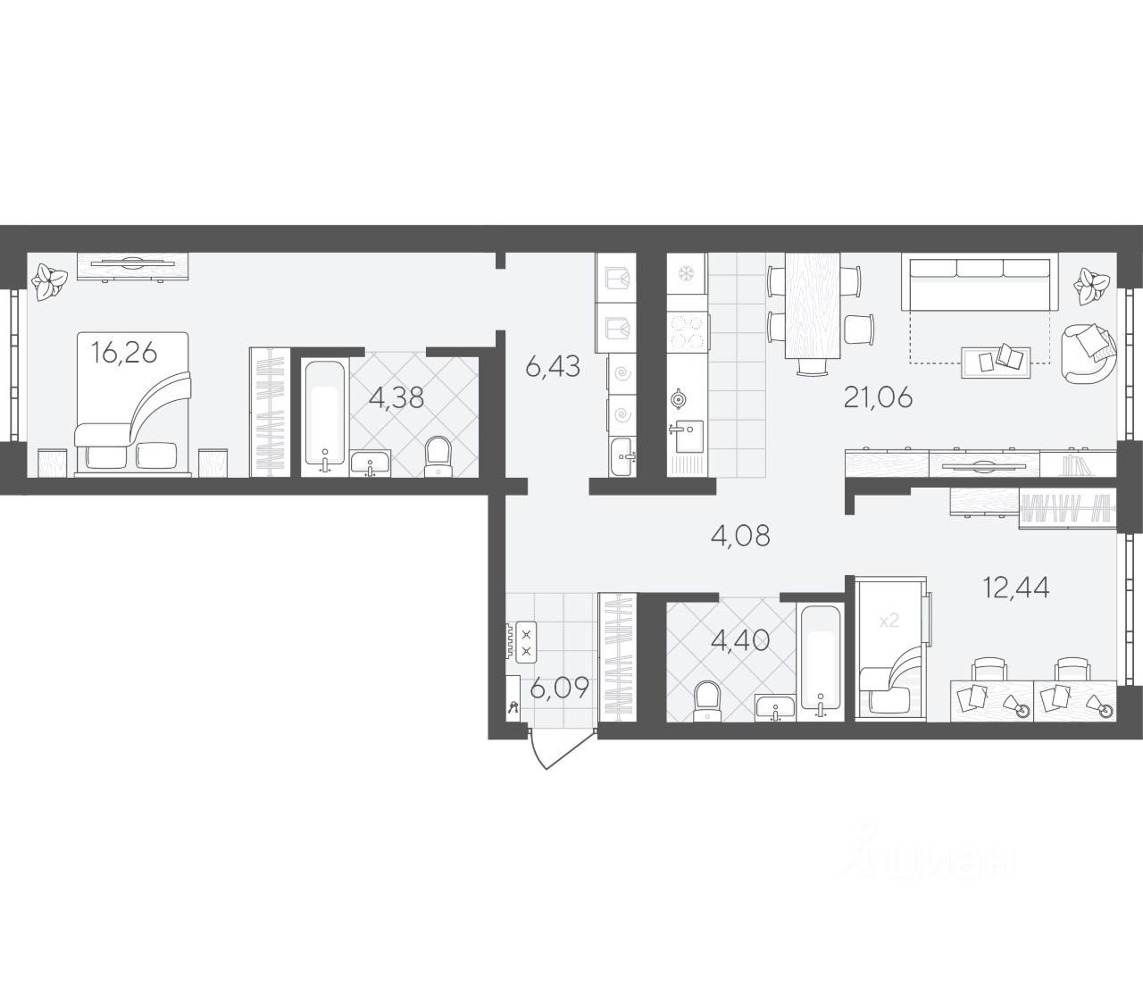 Квартира с 2 спальнями площадью 75,14 кв.м