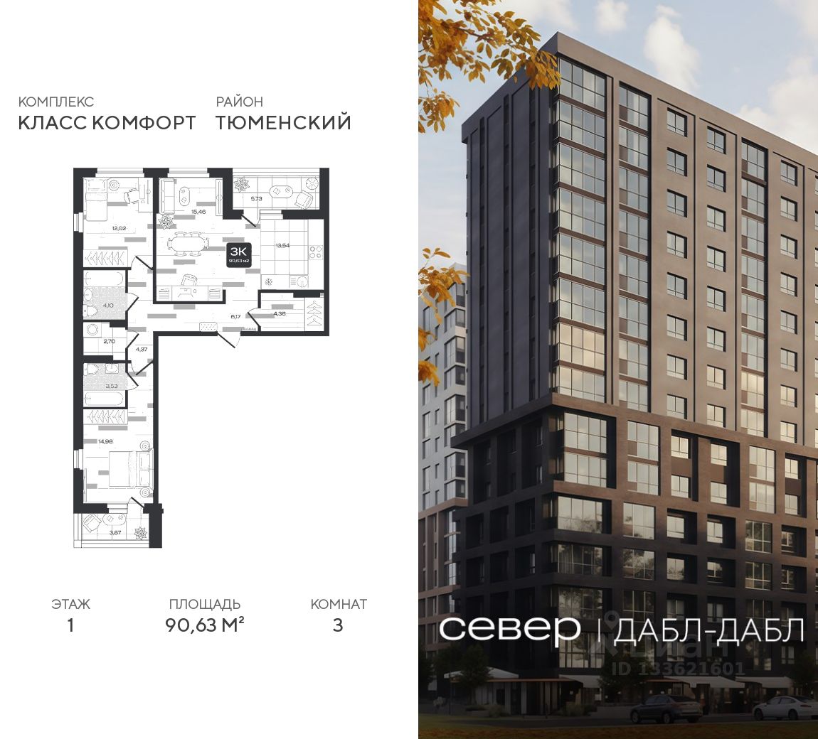 Продаётся квартира площадью 90.63 м2 в жилом комплексе ''Дабл-Дабл''. Квартира находится на 1 этаже, жилая площадь квартиры 42.46 м2, площадь просторной кухни — 13.54 м2. Среди особенностей планировки — изолированные комнаты с окнами на одну сторону, 1 совмещённый санузел.