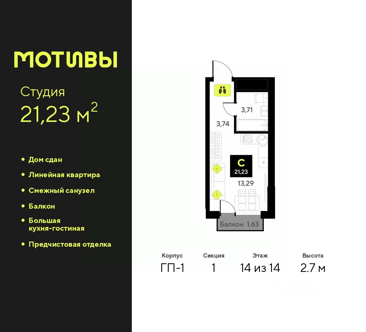 Просторная однокомнатная квартира-студия с предчистовой отделкой в ЖК ''Мотивы'' на 14 этаже. Общая площадь: 21.23 кв.м., площадь гостиной 13.29 кв.м., из которых 5 кв.м. выделено под кухонную зону. Все окна выходят на одну сторону. В квартире один балкон, один совмещенный санузел. Высота потолков 2.7 м.