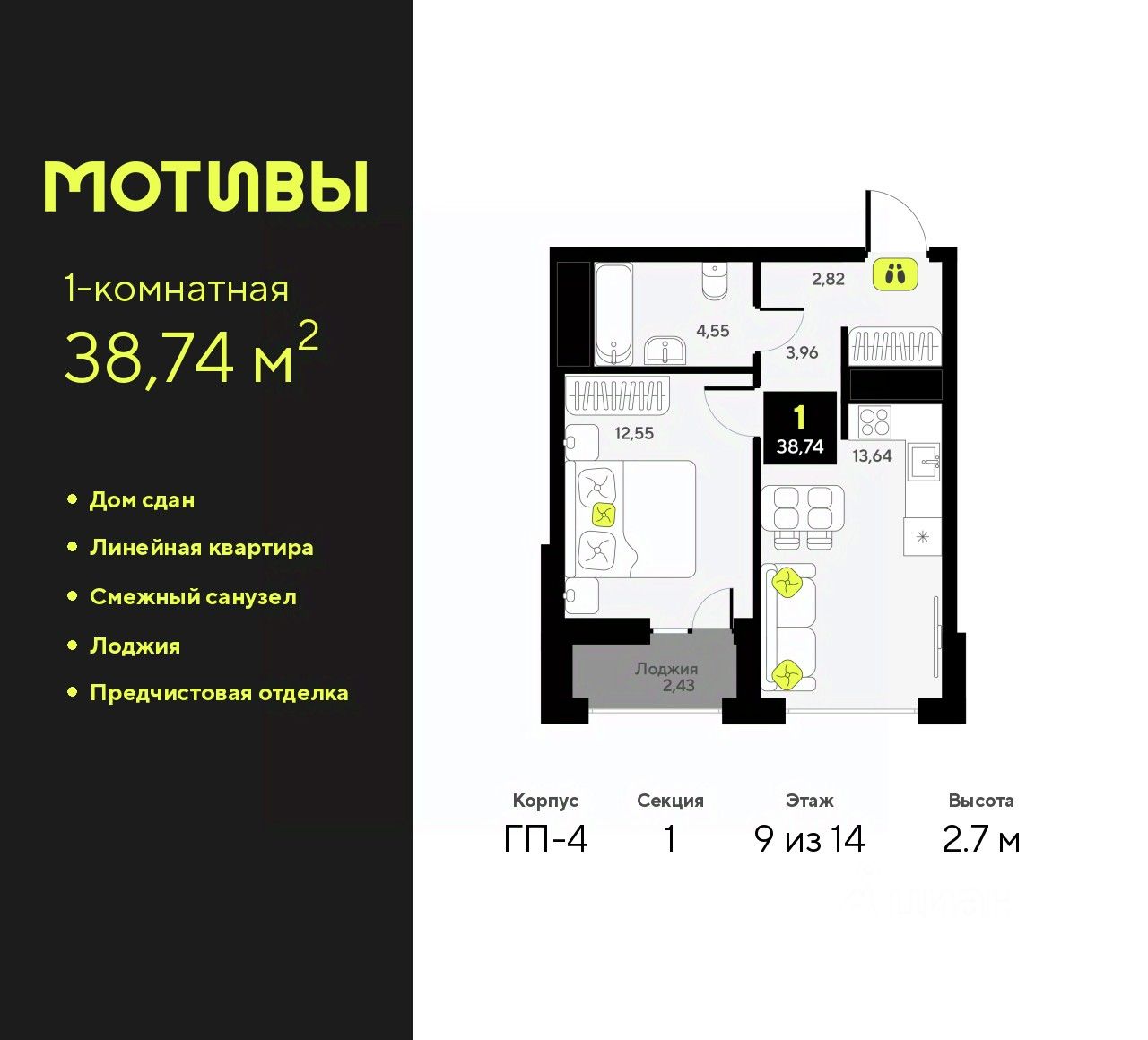 1-комн. квартира от застройщика с предчистовой отделкой в ЖК ''Мотивы'' на 9 этаже. Общая площадь: 38.74 кв.м., жилая: 12.55 кв.м., площадь просторной кухни-столовой: 13.64 кв.м. Все окна выходят на одну сторону. В квартире одна лоджия, один совмещенный санузел. Высота потолков 2.7 м.