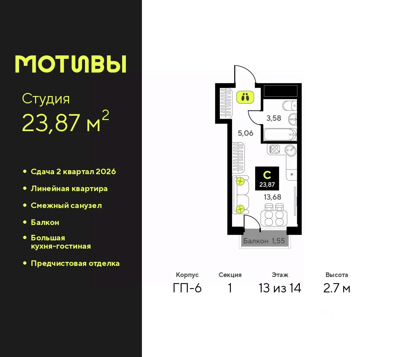 1-комн. квартира-студия с предчистовой отделкой в ЖК ''Мотивы'' на 13 этаже. Общая площадь: 23.87 кв.м., площадь гостиной 13.68 кв.м., из которых 5 кв.м. выделено под кухонную зону. Все окна выходят на одну сторону. В квартире один балкон, один совмещенный санузел. Высота потолков 2.7 м.