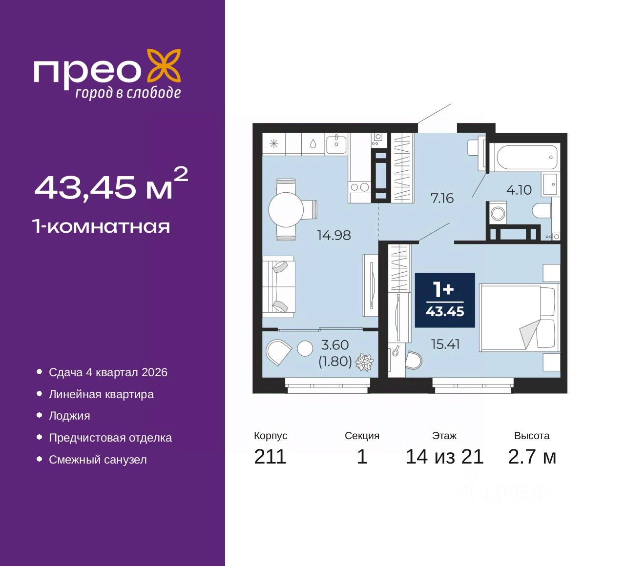 Однокомнатная квартира с предчистовой отделкой в ЖК ''Прео'' на 14 этаже. Общая площадь: 43.45 кв.м., жилая: 15.41 кв.м., площадь просторной кухни-столовой: 14.98 кв.м. Все окна выходят на одну сторону. В квартире одна лоджия, один совмещенный санузел. Высота потолков 2.7 м.