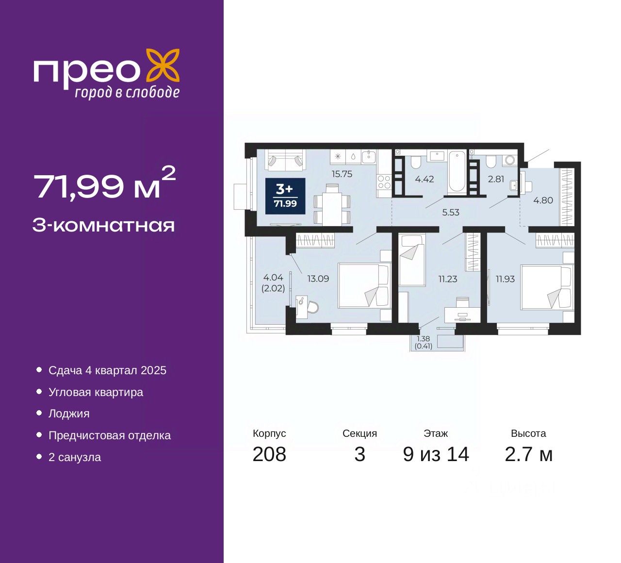 Трехкомнатная квартира с предчистовой отделкой в ЖК ''Прео'' на 9 этаже. Общая площадь: 71.99 кв.м., жилая: 36.25 кв.м., площадь просторной кухни-столовой: 15.75 кв.м. Квартира угловая, очень светлая, естественная вентиляция при открытии окон. В квартире одна лоджия, один совмещенный и один раздельный санузел. Высота потолков 2.7 м.