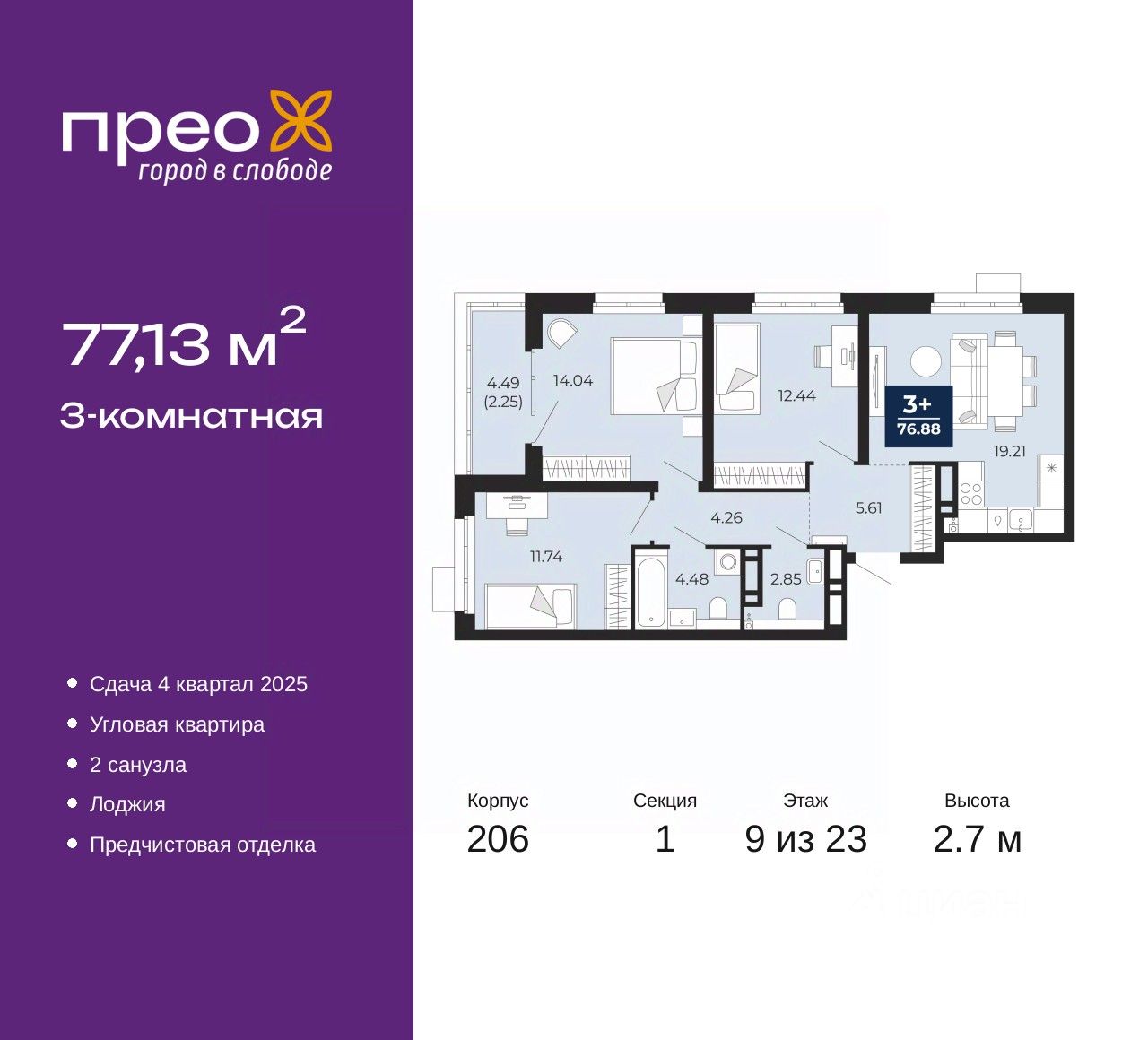 Продается 3-комн. квартира от застройщика с предчистовой отделкой в ЖК ''Прео'' на 9 этаже. Общая площадь: 77.13 кв.м., жилая: 38.22 кв.м., площадь просторной кухни-столовой: 19.21 кв.м. Квартира угловая, идеально подойдет любителям тишины и панорамных видов. В квартире одна лоджия, один совмещенный и один раздельный санузел. Высота потолков 2.7 м.