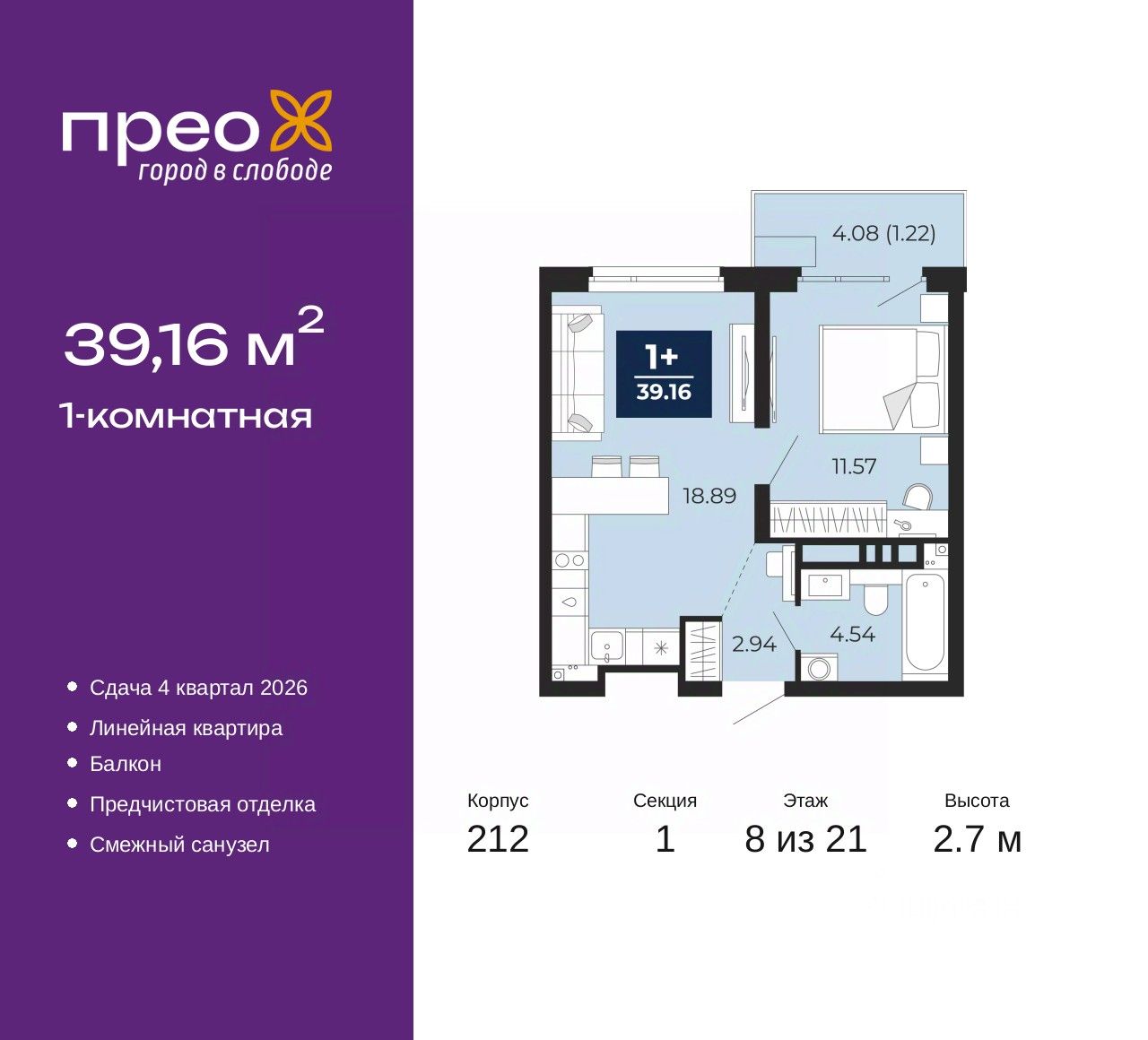 Однокомнатная квартира от застройщика с предчистовой отделкой в ЖК ''Прео'' на 8 этаже. Общая площадь: 39.16 кв.м., жилая: 11.57 кв.м., площадь просторной кухни-столовой: 18.9 кв.м. Все окна выходят на одну сторону. В квартире один балкон, один совмещенный санузел. Высота потолков 2.7 м.