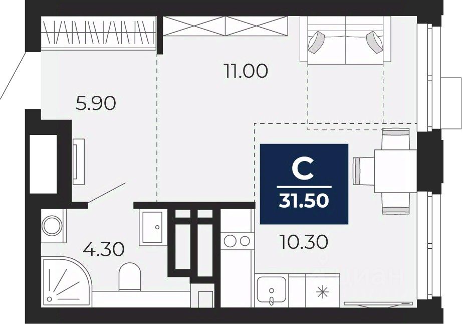 1-комн. квартира-студия от застройщика с предчистовой отделкой в ЖК ''Айвазовский City'' на 17 этаже. Общая площадь: 31.5 кв.м., площадь гостиной 21.3 кв.м., из которых 10.3 кв.м. выделено под кухонную зону. Все окна выходят на одну сторону. В квартире один совмещенный санузел. Высота потолков 2.7 м.