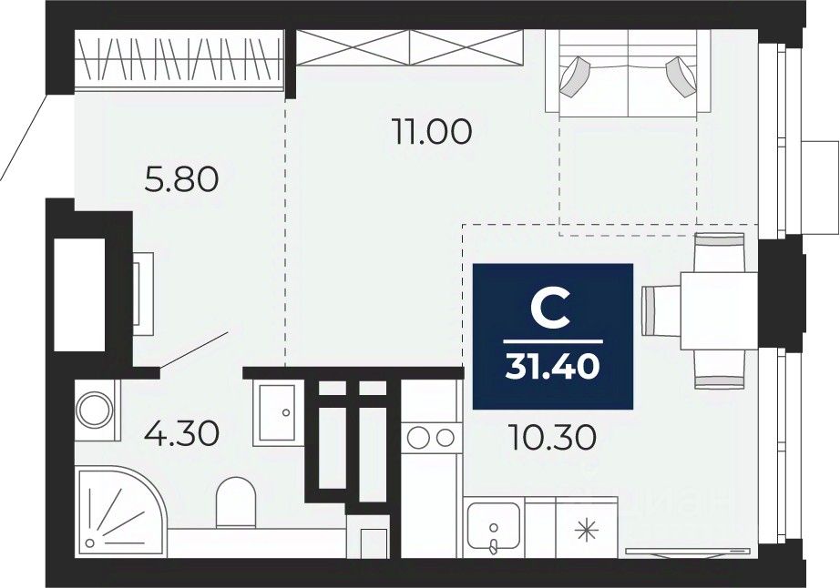 Продается 1-комн. квартира-студия с предчистовой отделкой в ЖК ''Айвазовский City'' на 14 этаже. Общая площадь: 31.4 кв.м., площадь гостиной 21.3 кв.м., из которых 10.3 кв.м. выделено под кухонную зону. Все окна выходят на одну сторону. В квартире один совмещенный санузел. Высота потолков 2.7 м.