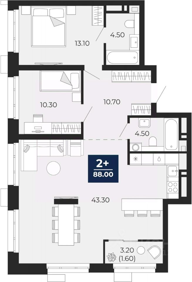 Двухкомнатная квартира с предчистовой отделкой в ЖК ''Айвазовский City'' на 7 этаже. Общая площадь: 88 кв.м., жилая: 23.4 кв.м., площадь просторной кухни-столовой: 43.3 кв.м. Квартира угловая, окна oбecпeчивaют paвнoмepнoe ocвeщeниe в тeчeниe дня. В квартире одна лоджия, два совмещенных санузла. Высота потолков 2.72 м.