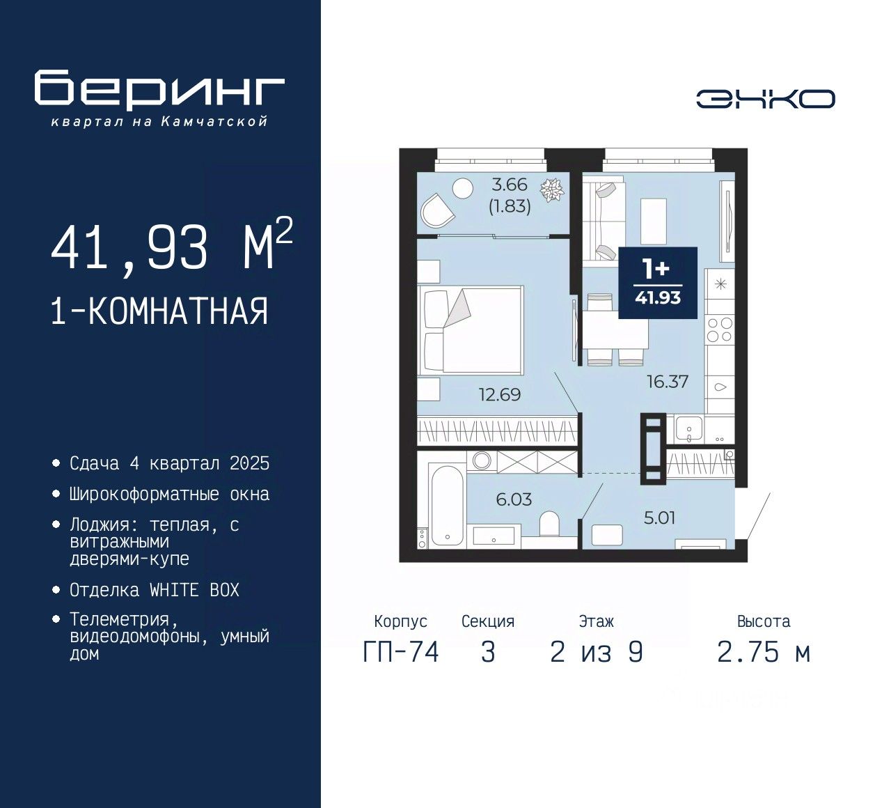 Однокомнатная квартира от застройщика в ЖК ''Беринг'' на 2 этаже. Квартира без отделки, полностью готова к чистовой отделке и дальнейшему ремонту. Общая площадь: 41.93 кв.м., жилая: 12.69 кв.м., площадь просторной кухни-столовой: 16.37 кв.м. Все окна выходят на одну сторону. В квартире одна лоджия, один совмещенный санузел. Высота потолков 2.75 м.
