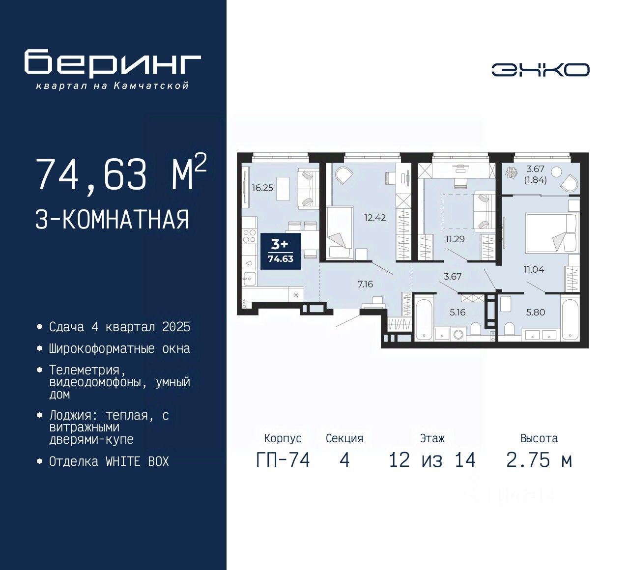 3-комн. квартира в ЖК ''Беринг'' на 12 этаже. Квартира без отделки, после оформления собственности можно делать ремонт. Общая площадь: 74.63 кв.м., жилая: 34.75 кв.м., площадь просторной кухни-столовой: 16.25 кв.м. Комнаты изолированные, все окна выходят на одну сторону. В квартире одна лоджия, два совмещенных санузла. Высота потолков 2.75 м.