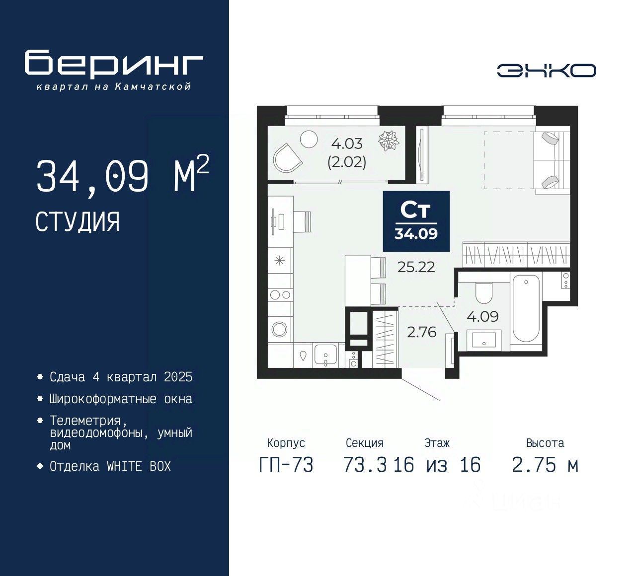 Однокомнатная квартира-студия в ЖК ''Беринг'' на 16 этаже. Квартира без отделки, после выдачи ключей можно делать ремонт. Общая площадь: 34.09 кв.м., площадь гостиной 25.22 кв.м., из которых 5 кв.м. выделено под кухонную зону. Все окна выходят на одну сторону. В квартире один совмещенный санузел. Высота потолков 2.75 м.